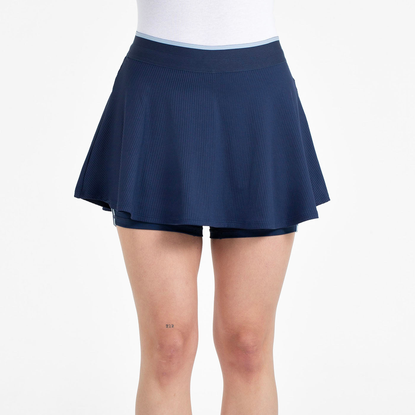 Falda de nuestra línea Timeless. Diseño con vuelo, cinturilla con banda elástica bicolor, cordones para ajustar, malla interior con inserciones en los laterales de cinta rachel y logo bordado. Confeccionada en tejido de punto texturizado de poliéster reciclado con spandex, cuenta con certificado de hilo Repreve.